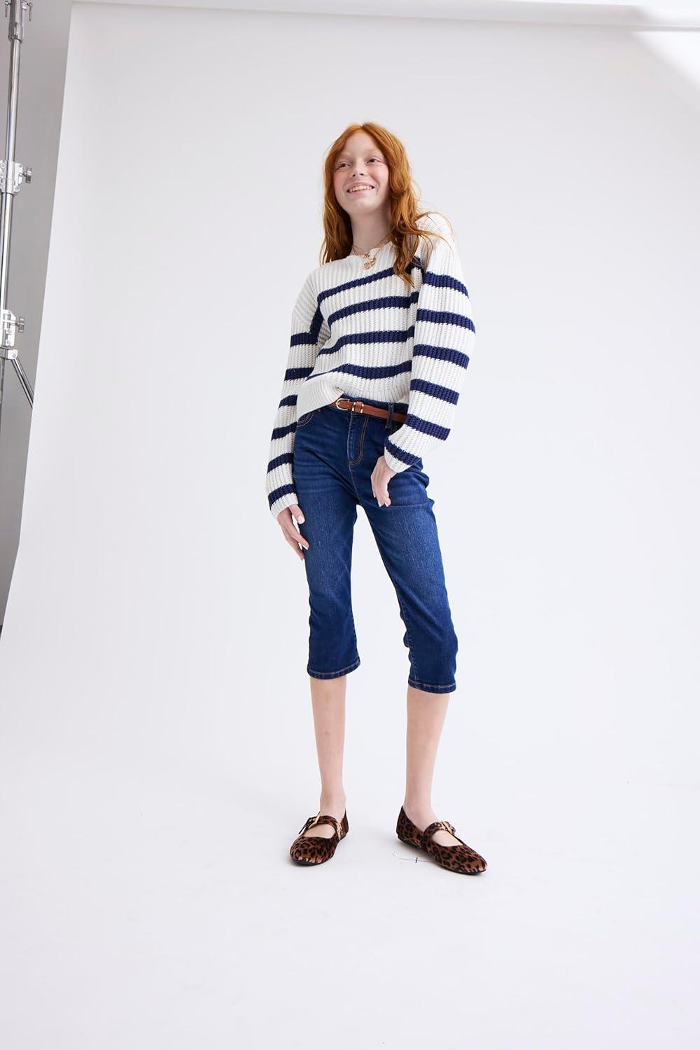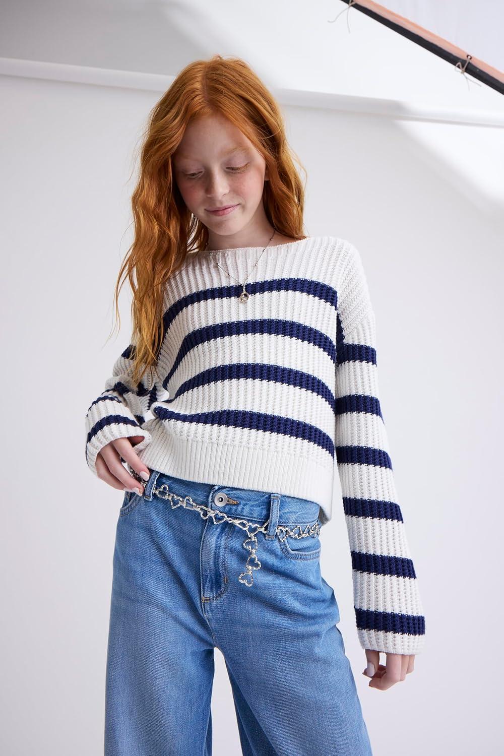 The Children’s Place Girls’ Long Sleeve Crew Neck Pullover Sweater(Tidal Stripe)