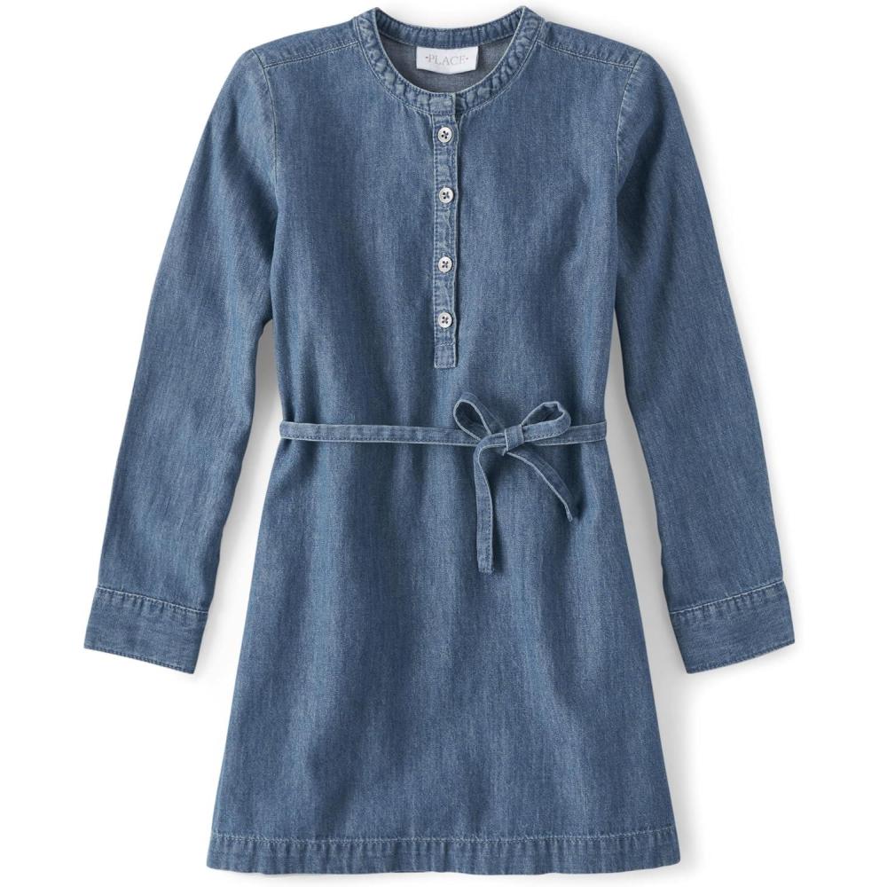 The Children’s Place Girls’ Long Sleeve Everyday Dress(Aries Denim Wash)
