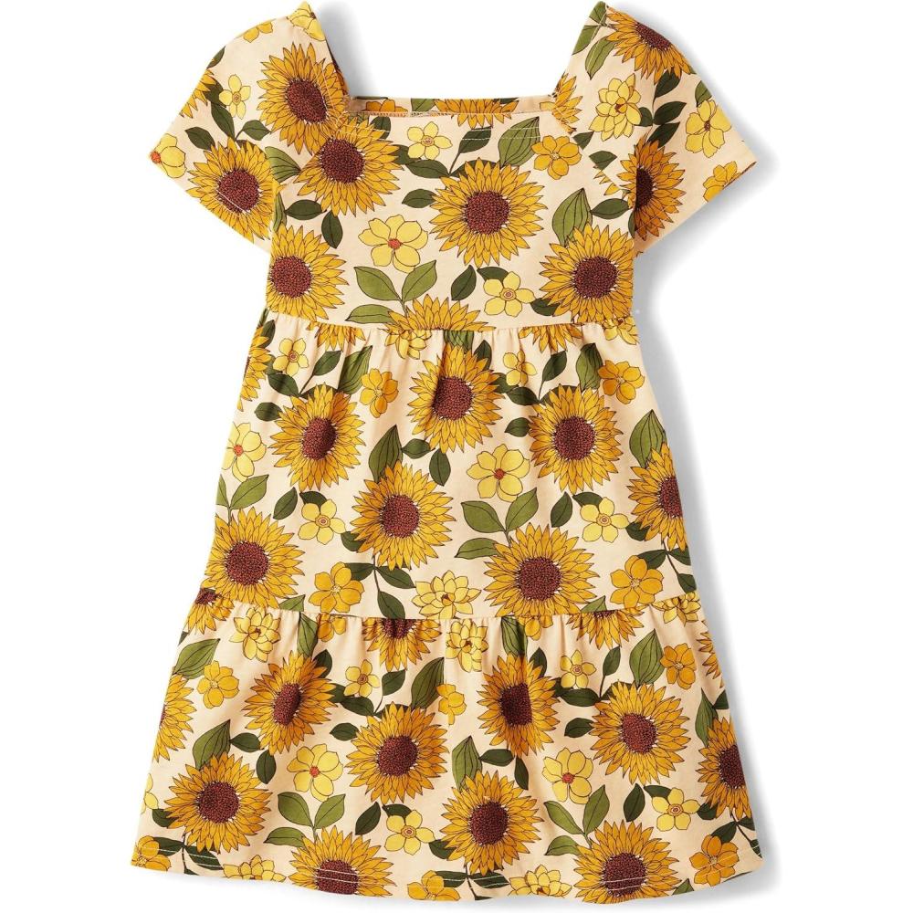The Children’s Place Girls’ Plaid Stretch Jacquard Short Sleeve Dress(Yellow Sunflower Tiered)